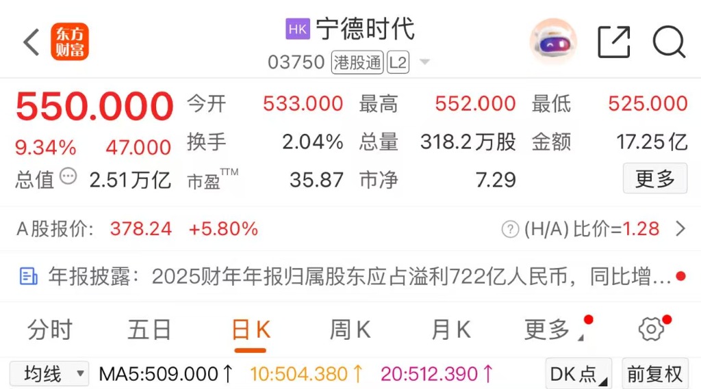 上证报中国证券网讯3月10日,宁德时间H股早盘一度涨近10%。规模10时25分,涨9.34%,报550港元/股。A股方面,宁德时间一度涨超6%。